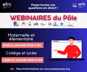 Avant les Journées Portes Ouvertes, qui auront lieu du 15 au 29 janvier 2026, le Pôle Casablanca-Mohammedia propose deux webinaires dinformation ouverts à toutes les familles, en présence  des chefs d’établissement :