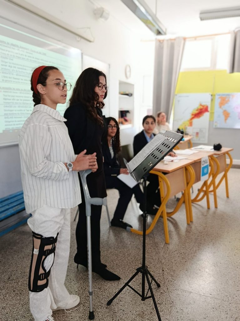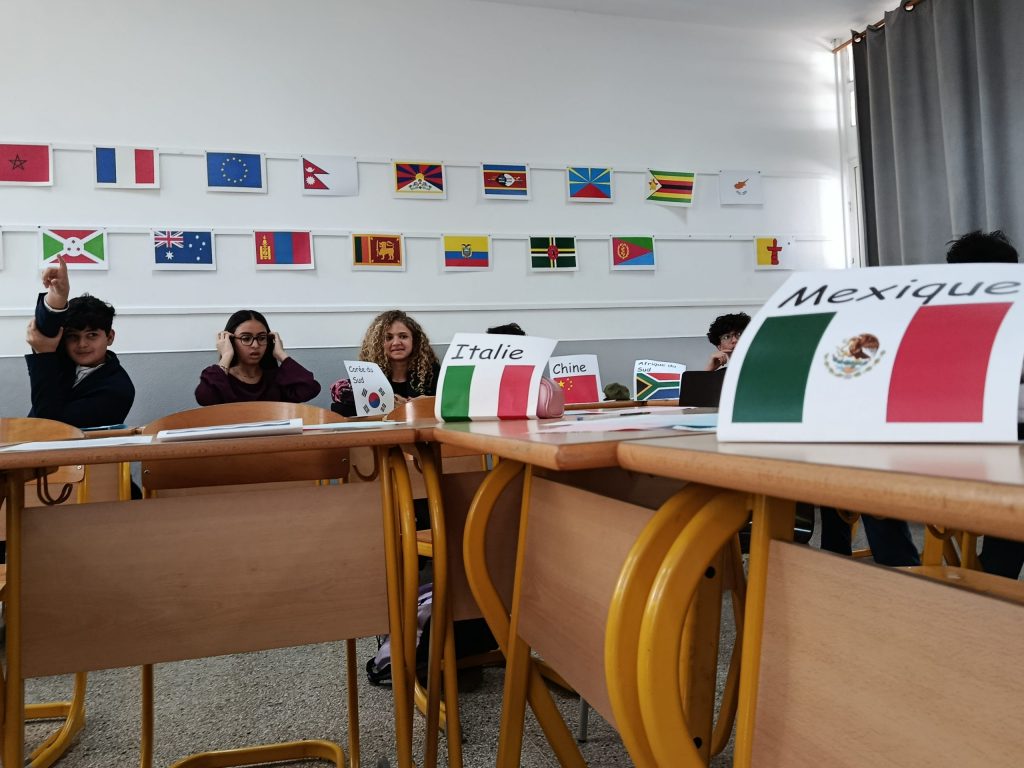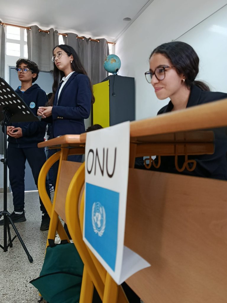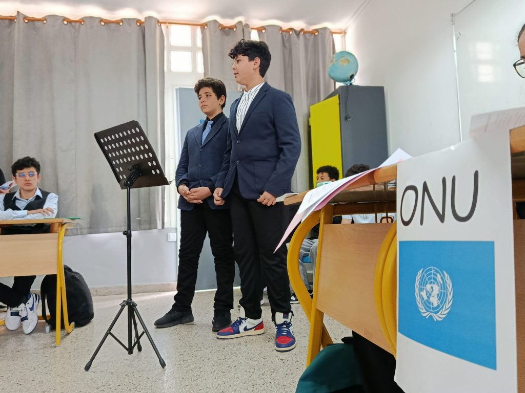 C’est ainsi les représentants de 18 ambassades du monde entier qu’ont incarnés nos apprentis-ambassadeurs à l’ONU. Les cours de Géographie en français et en arabe ; mais également les cours d’Anglais et de Français ont servi de rampe de lancement à ce beau projet riche en leçons. Thaïlande, Chine, Tadjikistan, Corée du Sud, Mexique, Chili, Paraguay, République dominicaine, Italie, Irlande, Pologne, Suède, Tunisie, Tanzanie, Togo, Afrique du Sud, Australie et Kiribati ont pu proposer leurs solutions d’avenir.