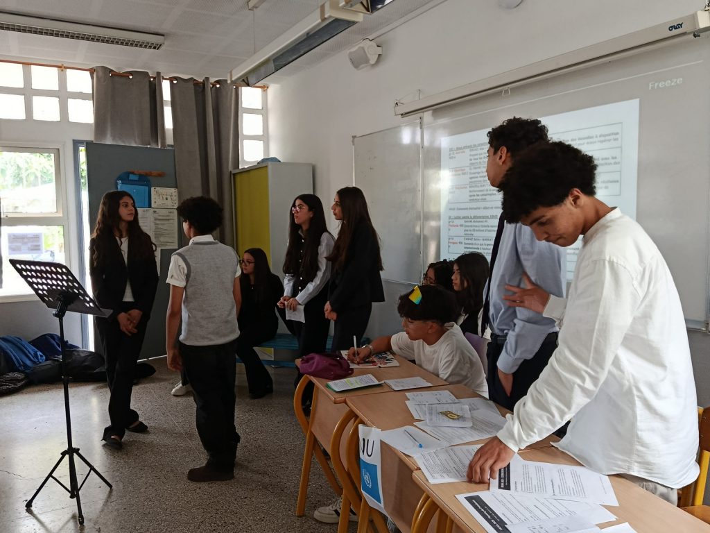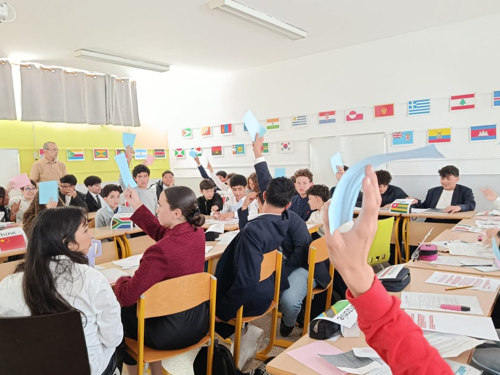 Le lundi 13 avril 2026 : les 90 résolutions ont été introduites en anglais et en arabe, présentées en français, puis débattues et votées en français. L’ensemble des participants a ainsi pu engager son intelligence et son éloquence dans des débats de haute-volée. Tous les élèves de 4e ont ainsi pu prendre la parole à la tribune dans l’une des 5 commissions, dans lesquelles siégeaient 1 ou 2 représentants de chaque pays. Les débats ont été organisés et orchestrés dès le mois de mars par une équipe de 18 présidents issus cette année de tous les pays présents.