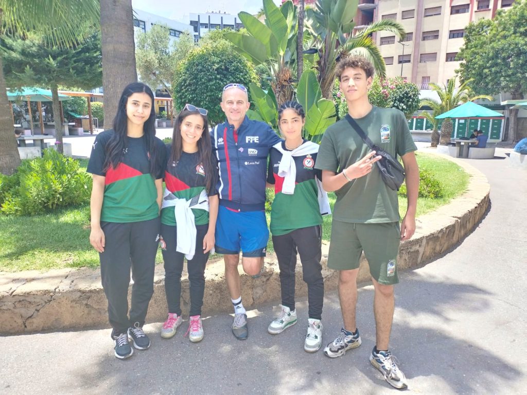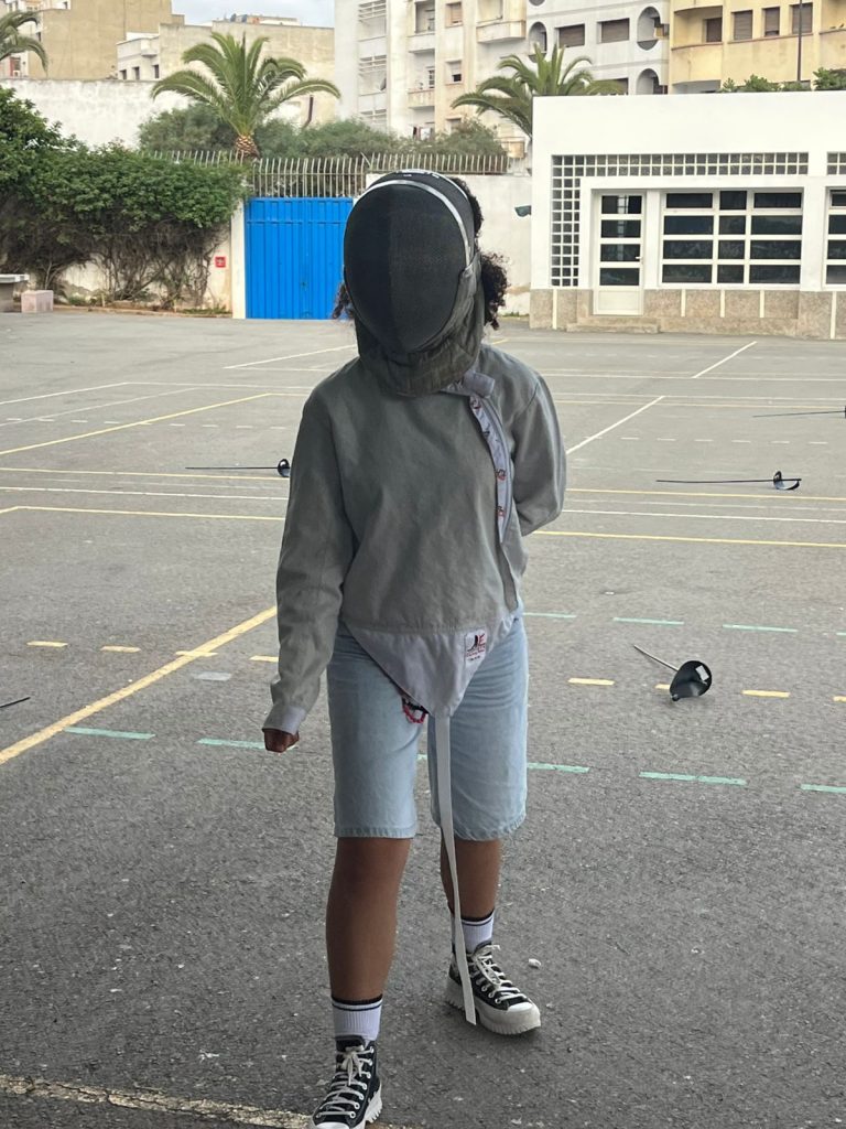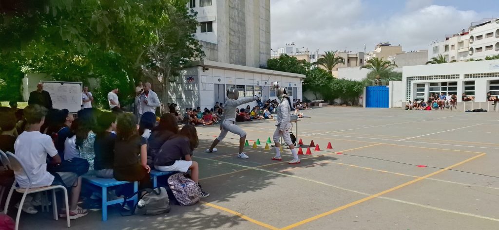 Mercredi, l’initiation s’est clôturée en beauté avec la venue de quatre jeunes champions marocains, membres de l’équipe nationale d’escrime. Mohamed et Inès, en catégorie cadet-junior, ainsi que Amal et Hiba, en catégorie senior, s’entraînent aux côtés de M. Esquerre dans la salle fédérale du complexe Mohamed V de Casablanca. Ces athlètes, parmi les meilleurs escrimeurs du royaume, ont offert aux élèves une démonstration de duels décryptés par M. Esquerre, ce qui a captivé les élèves : où toucher son adversaire ? Comment sont attribués les points ? Quels gestes respecter ?